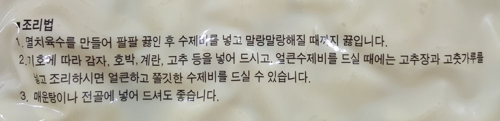 제품을 구입한 당일 국에 넣어 조리했는데, 어머니께서 조금 질기게 느끼셨는지 감자수제비는 거의 드시지 않았습니다.