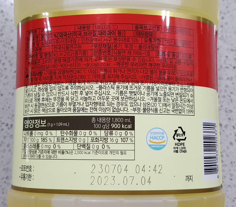 해표 식용유 콩기름 1.8L 가격, 원재료, 칼로리, 품목보고번호, 콩기름 유통기한, 주의사항 外
