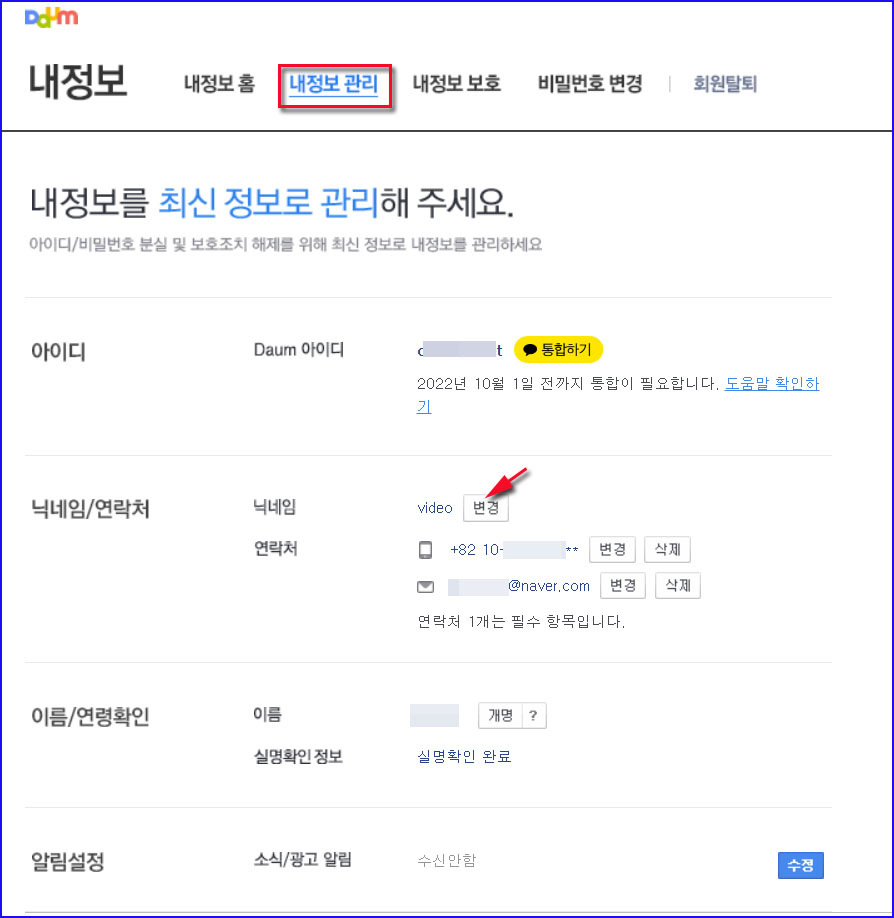 4. 내 정보 관리의 '닉네임/연락처' 항목에서