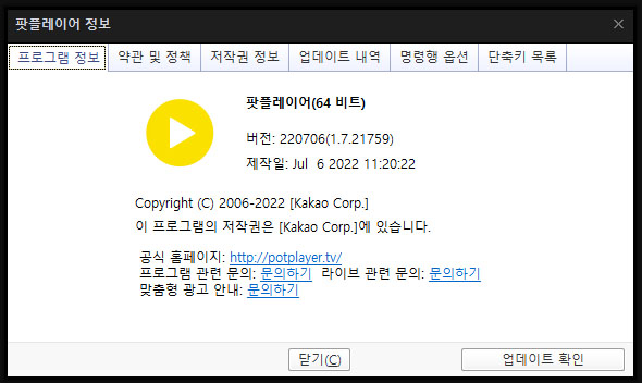 2022년 7월 6일 팟플레이어가 220706(1.7.21759) 버전으로 업데이트되었습니다.