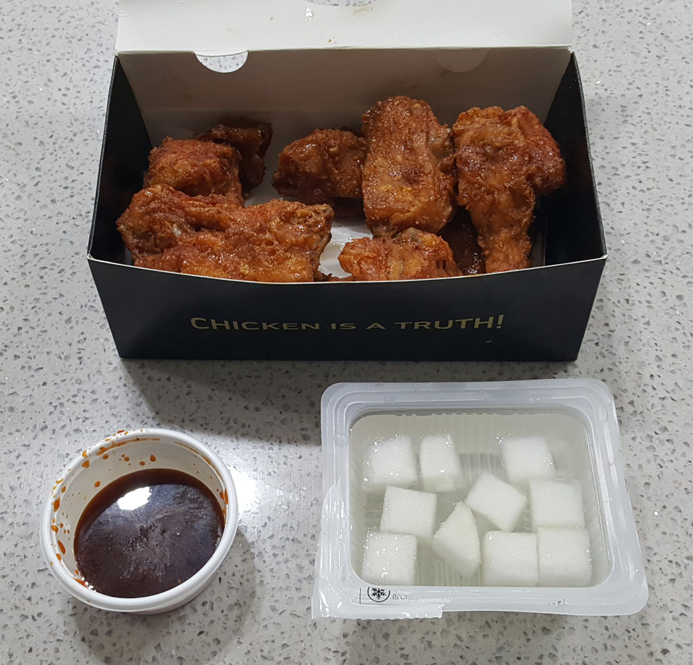영동농협하나로마트 치킨 코너에서 구매한 간장치킨에는 소스와 치킨무가 함께 포장되어 있었습니다.