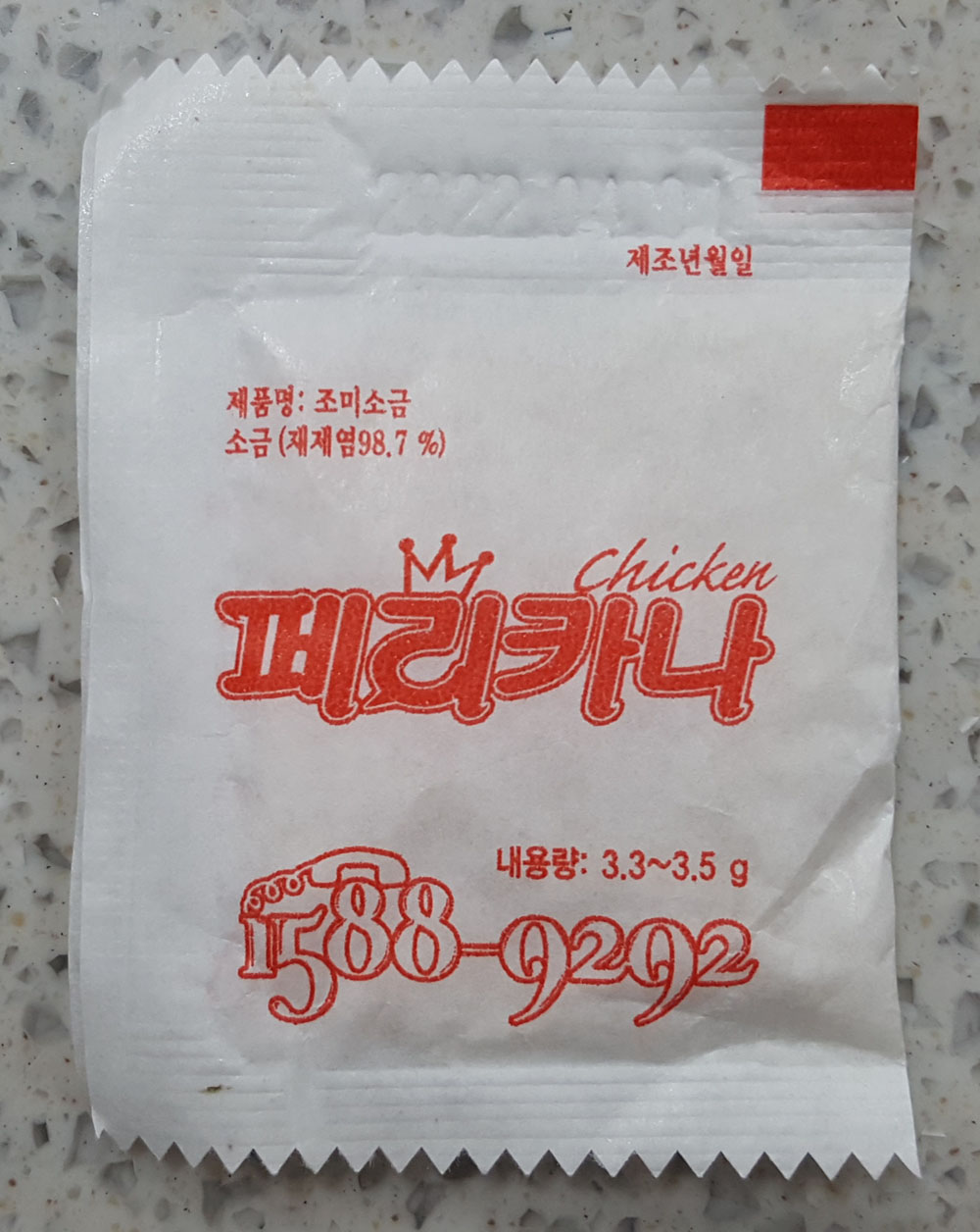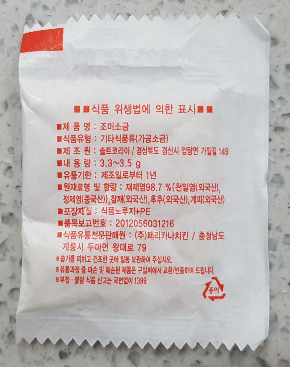 아래에 있는 것은 페리카나 치킨을 구매하면서 함께 포장된 치킨 조미소금에 관한 정보로