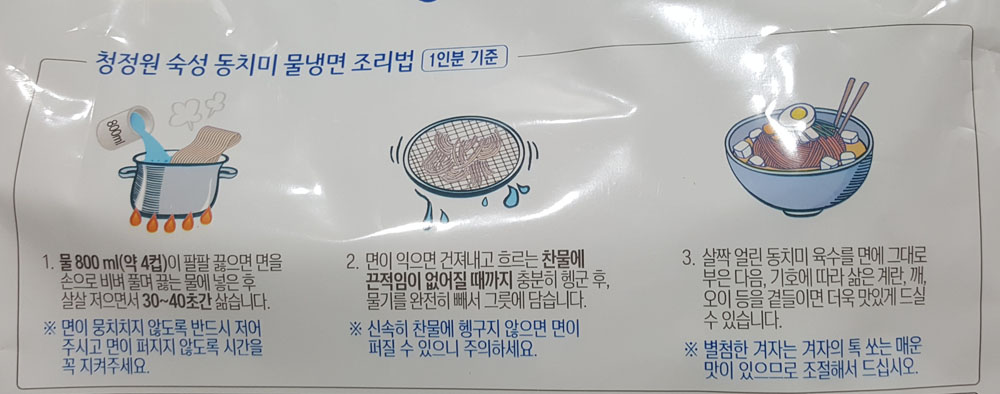 청정원 숙성 동치미 물냉면 조리법은 제품 포장에 인쇄된 내용을 참고하면 됩니다.