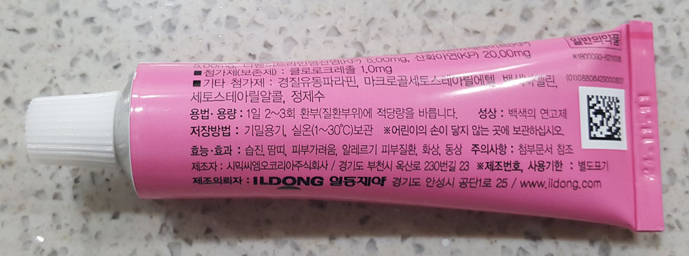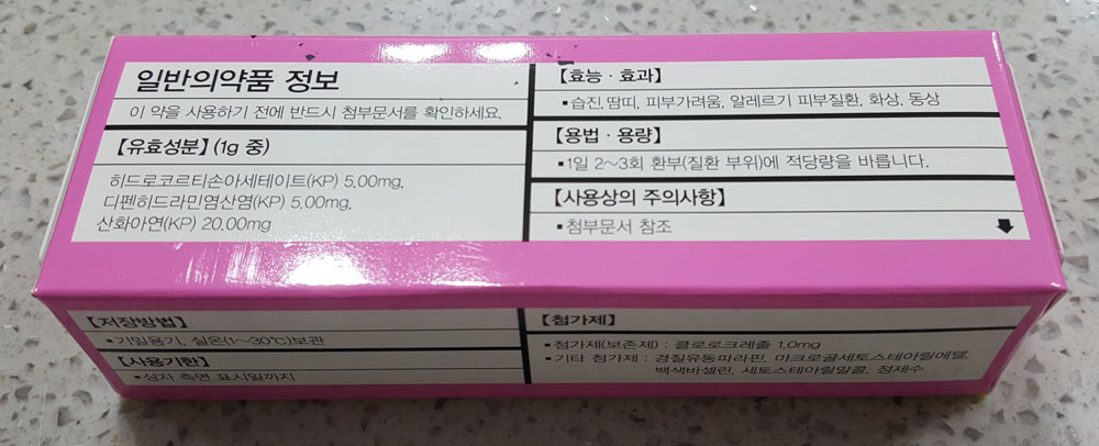 - 유효성분 : 히드로코르티손아세테이트 (KP) 5.00mg, 디펜히드라민염산염 (KP) 5.00mg, 산화아연 (KP) 20.00mg