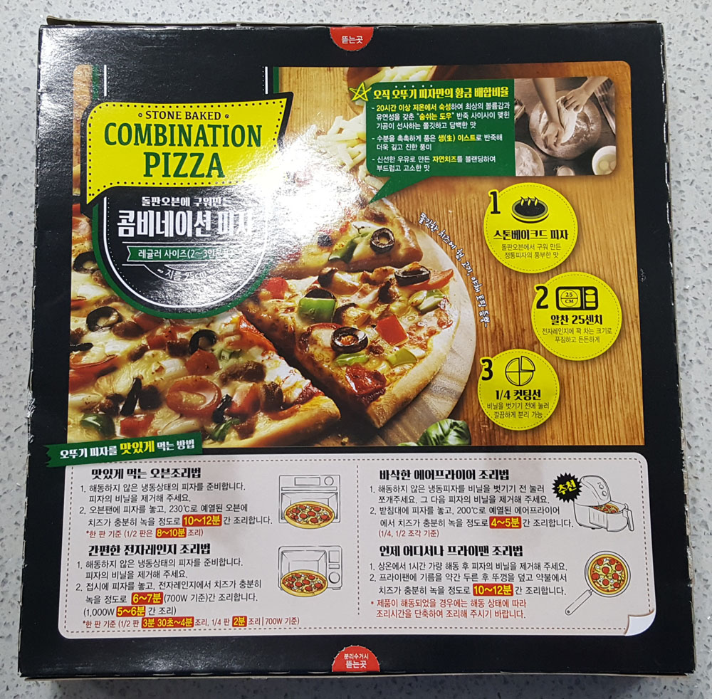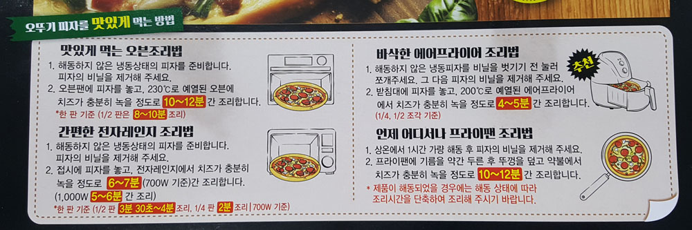 오븐, 전자레인지, 에어프라이어, 프라이팬 등으로 오뚜기 콤비네이션 피자를 조리하는 방법(조리시간 등)은 제품 포장 박스에 인쇄된 내용을 참고하면 됩니다.