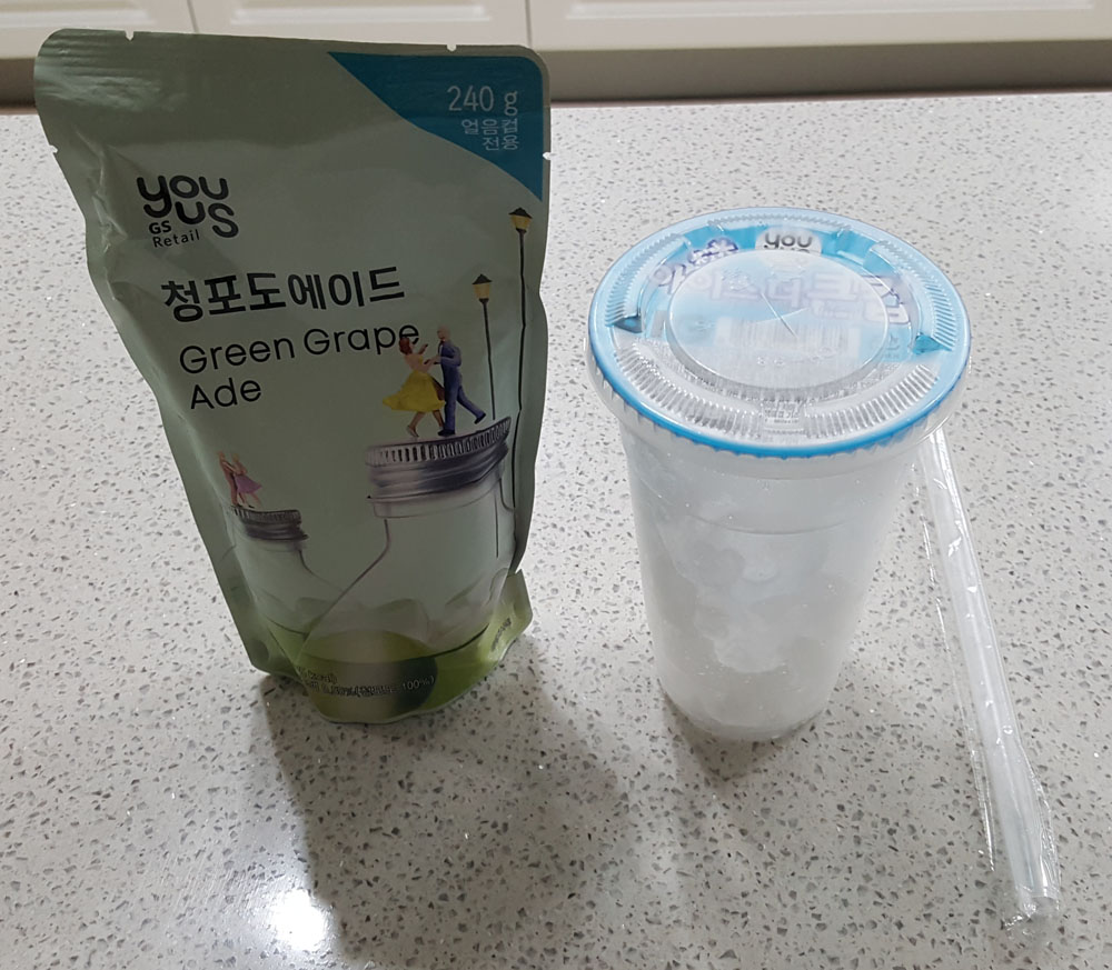 GS25 편의점에서 구매한 유어스 청포도에이드는 유어스 아이스더큰컵(240g 얼음컵 전용) 식용얼음에 타서 시원하게 마실 수 있는 혼합음료입니다.
