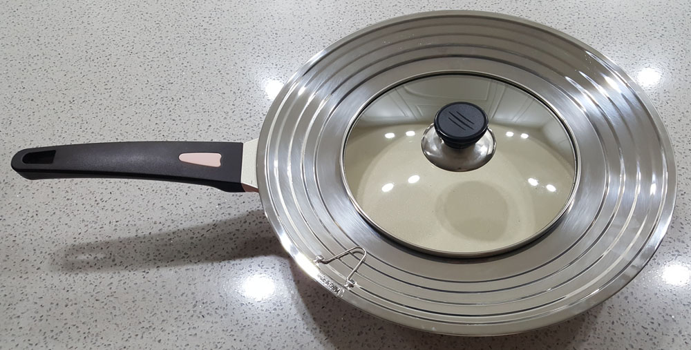 다이소에서 5,000원에 구매한 '다이소 다용도 멀티 뚜껑(스텐 유리 뚜껑)'은 후라이팬, 튀김팬, 냄비 등의 뚜껑으로 사용 가능한 제품으로, 지름 23 ~ 31cm 크기의 제품 뚜껑으로 사용할 수 있습니다.