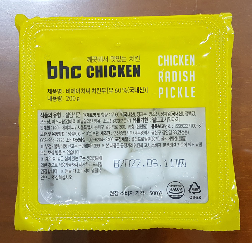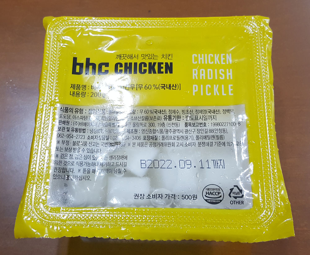 BHC 치킨 비에이치씨 치킨무 내용량, 가격, 제조원, 품목보고번호, 치킨무 원재료 및 유통기한 外
