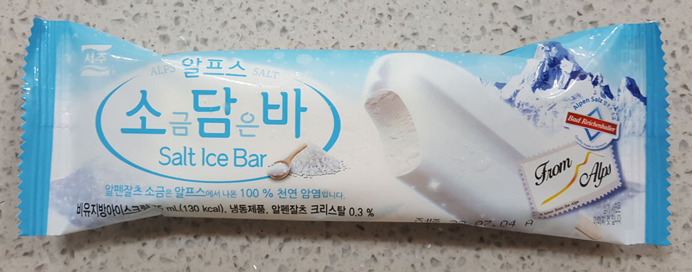 서주 '알프스 소금담은 바'는 알프스에서 나온 천연 암염인 알펜잘츠 소금(알펜잘츠 크리스탈)이 0.3% 함유된 막대 아이스크림으로, 처음 먹을 때는 너무 짜게 느껴져서 불편했는데 두 번째 먹으니 조금 괜찮게 느껴졌습니다.