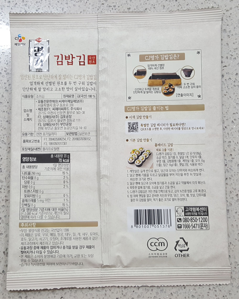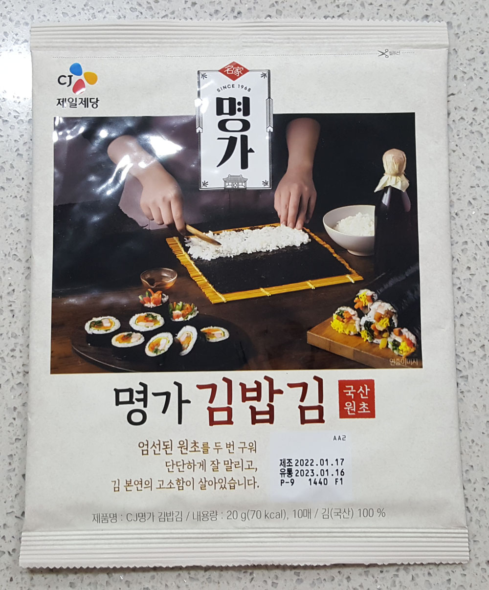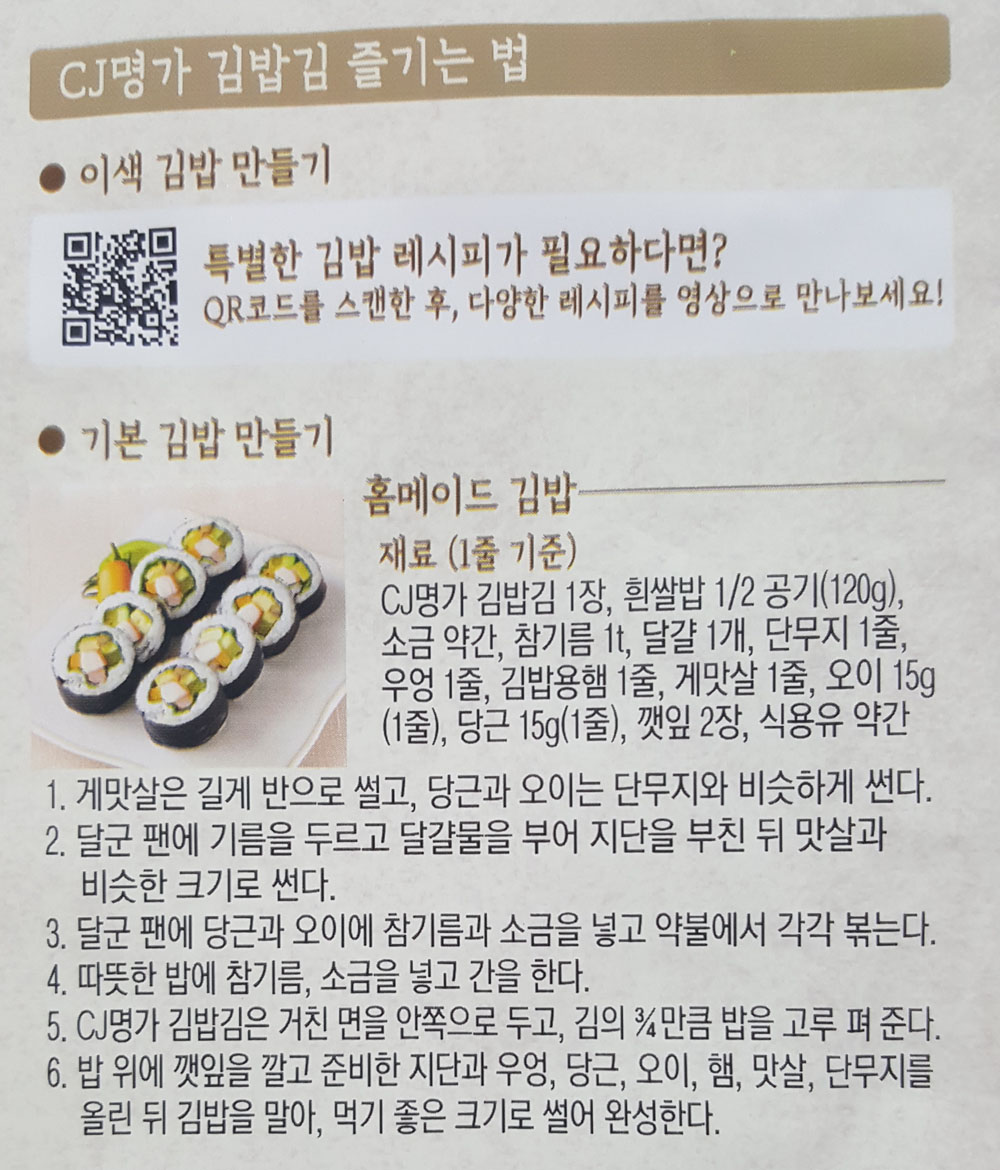 CJ 명가 김밥김 내용량, 칼로리, 제조원, 원재료 및 영양정보, 김 보관방법 및 유통기한 外