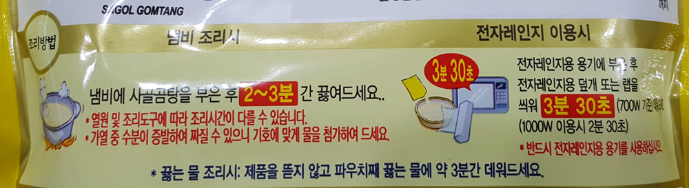 - 전자레인지 이용시 3분 30초 (700W 기준) ※ 봉지째 전자레인지 조리불가