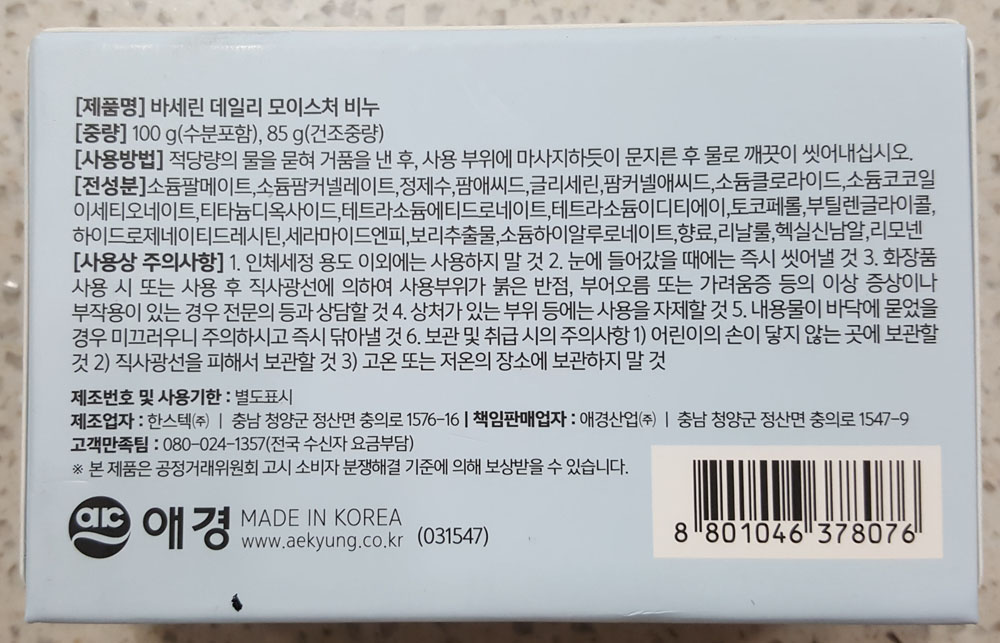바세린 데일리 모이스처 비누 중량 (건조 중량), 가격, 사용기한, 비누 성분, 주의사항 外
