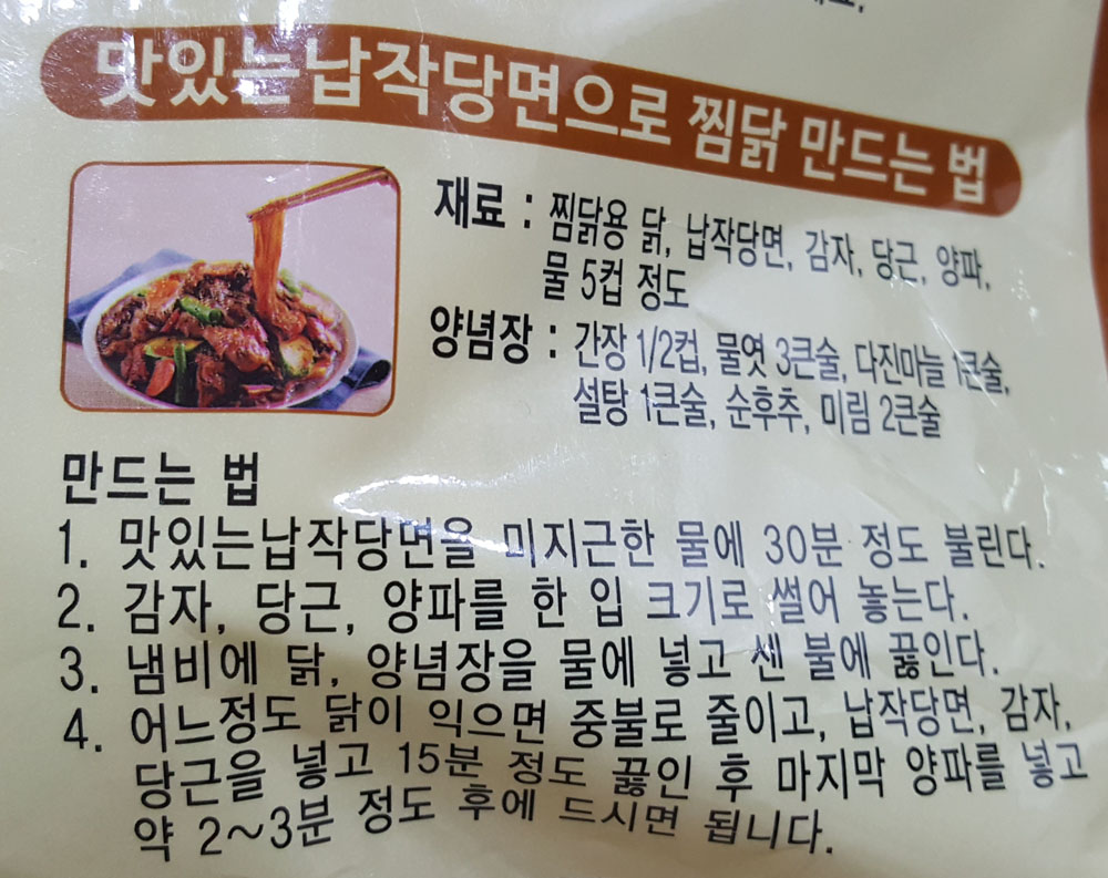 납작당면으로 찜닭을 만드는 방법은 제품 포장에 인쇄된 내용을 참고하면 됩니다.