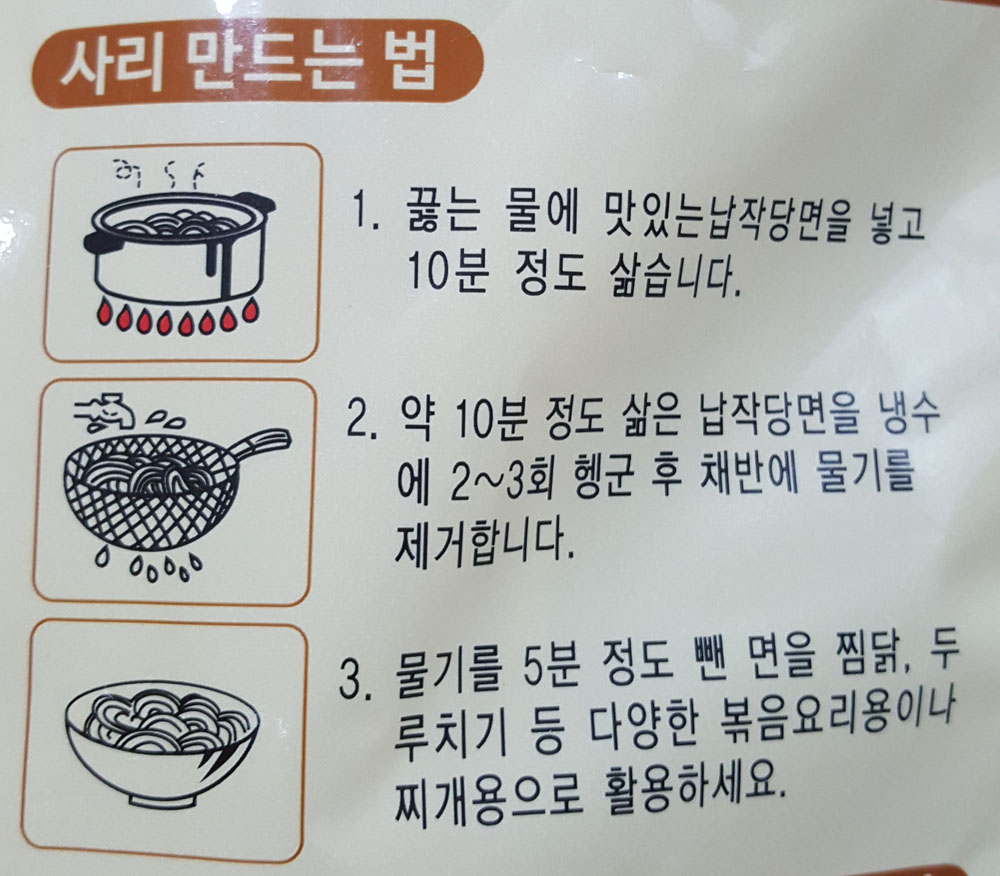 납작당면으로 사리는 만드는 방법은 제품 포장에 인쇄된 이미지와 내용을 참고하면 됩니다.