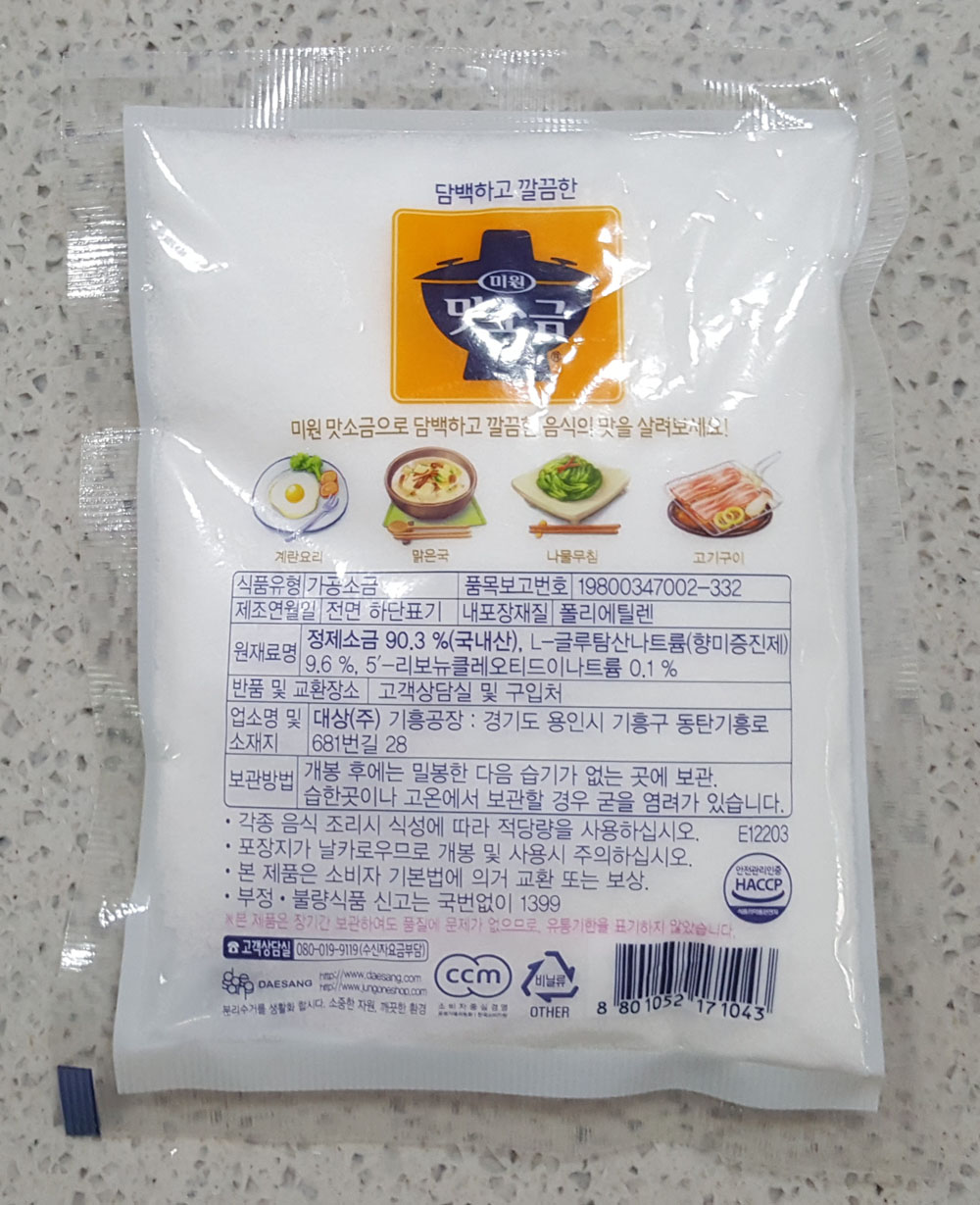 아래에 있는 것은 미원 맛소금에 관한 정보로 제품 포장에 인쇄된 내용을 그대로 옮겨온 것입니다.