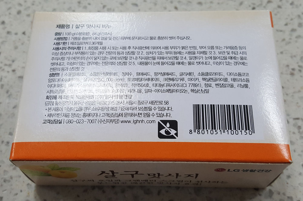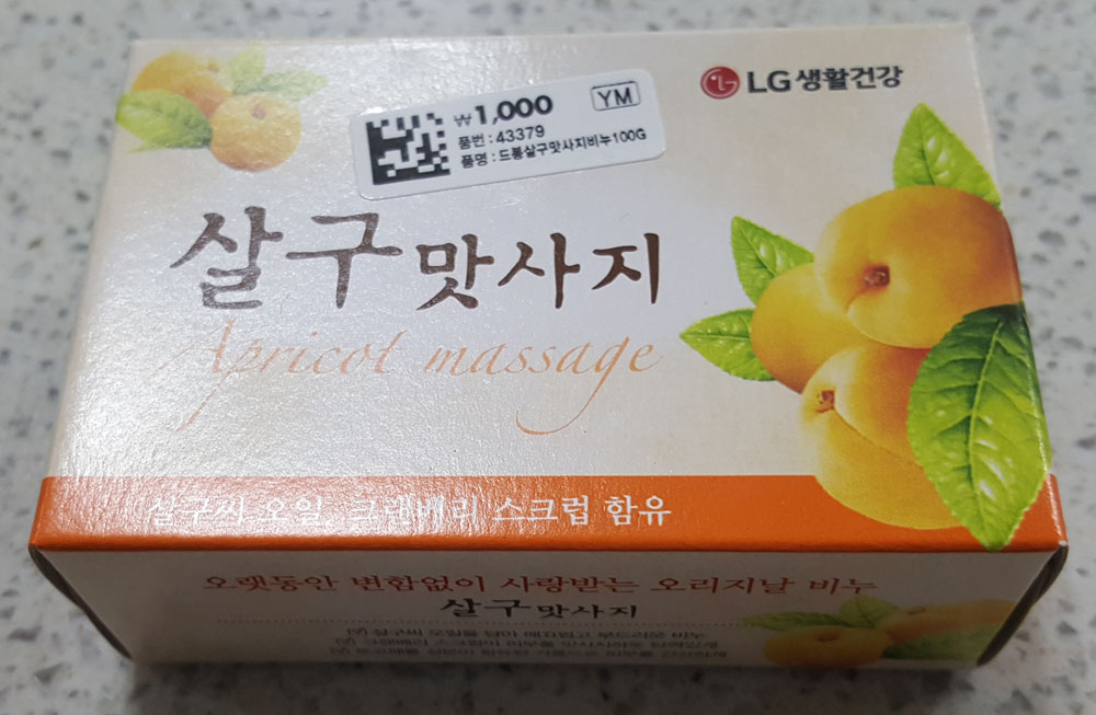 아래에 있는 것은 다이소에서 구매한 LG생활건강의 살구 맛사지 비누에 관한 정보로, 제품 포장에 인쇄된 내용을 그대로 옮겨온 것입니다.