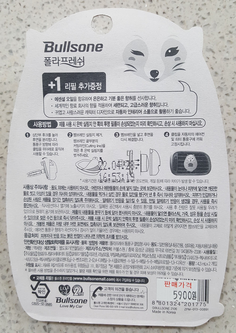 아래에 있는 것은 불스원 폴라프레쉬 자동차 통풍구 클립형 샤샤 - 화이트플로럴 제품 포장에 인쇄된 내용을 그대로 옮겨온 것입니다.