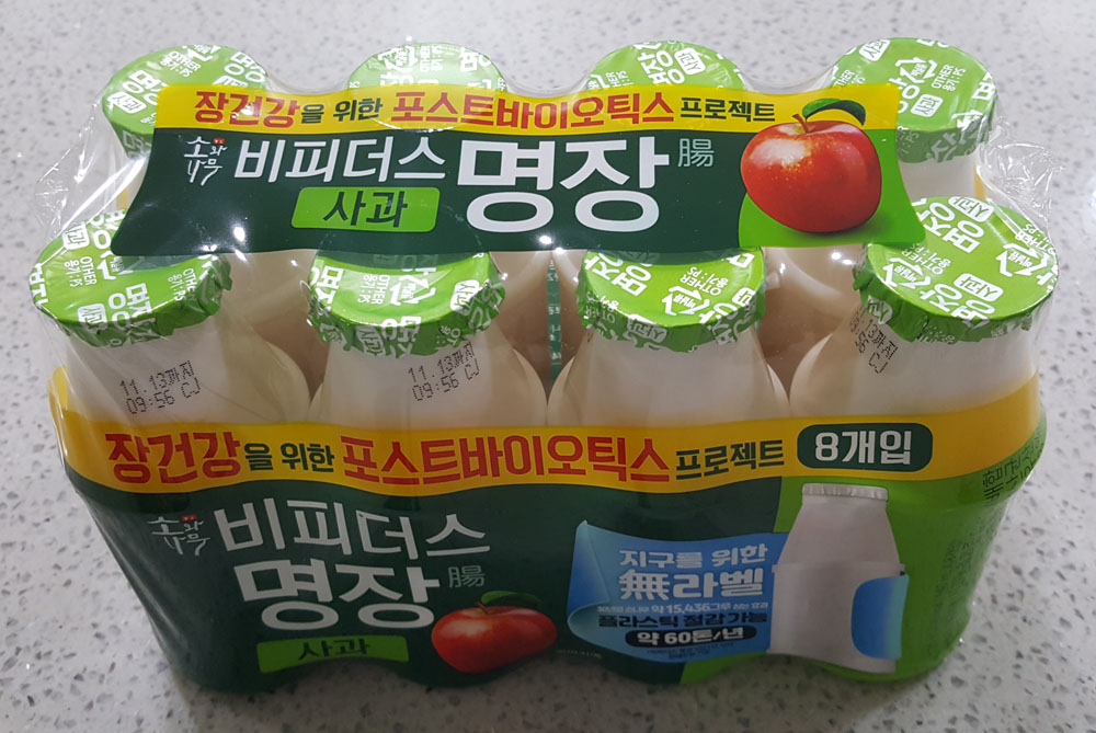 발효유 / 냉장제품 / 사과농축과즙 0.4% (배합 함량 사과 100%), 비피도박테륨유산균 0.0003%, 포스트바이오틱스 3종 유산균혼합분말 0.0017%, 올리고당 1.8%