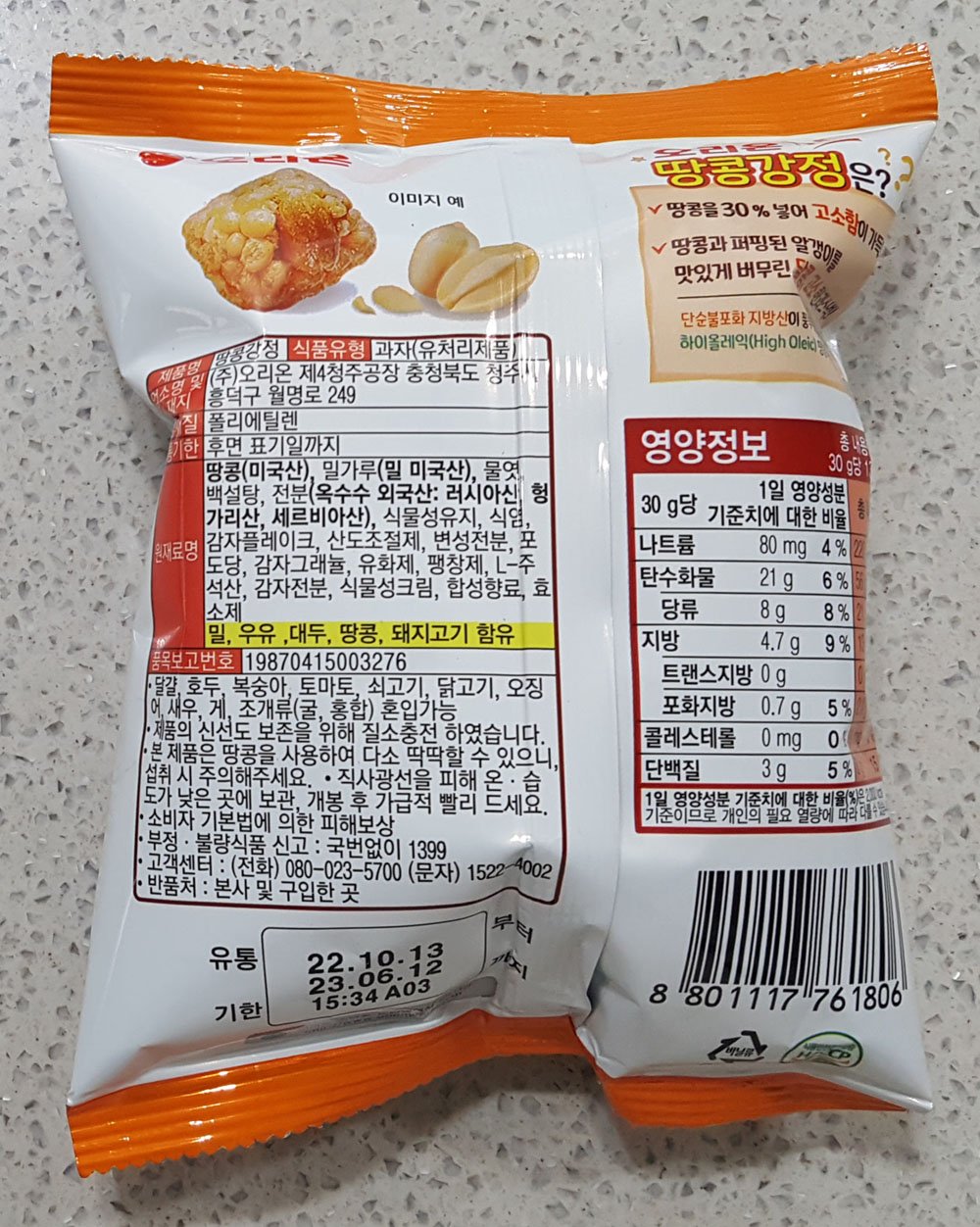 오리온 땅콩강정 80g 칼로리, 가격, 품목보고번호, 원재료 및 영양정보, 땅콩 강정 유통기한 外