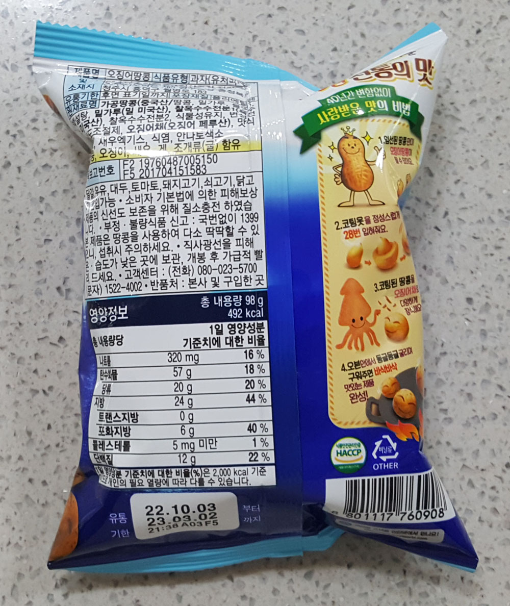 오리온 오징어 땅콩 내용량, 칼로리, 가격, 품목보고번호, 원재료 및 영양정보, 오징어 땅콩 유통기한 外