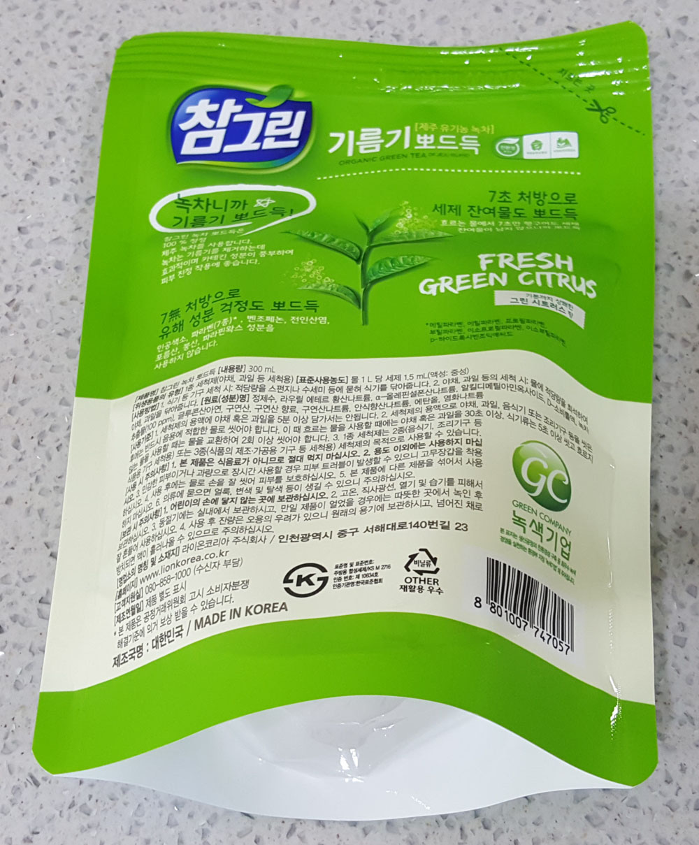 - 녹차니까 기름기 뽀드득! : 참그린 녹차 뽀드득은 100% 청정 제주 녹차를 사용합니다. 녹차는 기름기를 제거하는데 효과적이며 카테킨 성분이 풍부하여 피부 진정 작용에 좋습니다.