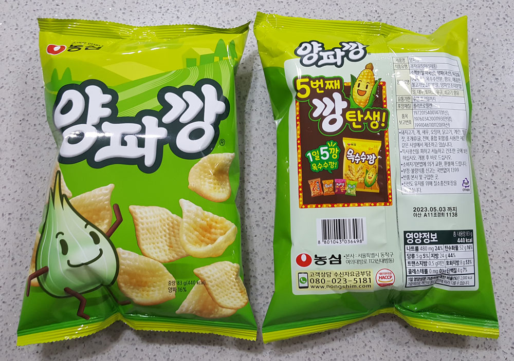 아래에 있는 것은 농심 양파깡에 관한 정보로, 제품 포장에 인쇄된 내용을 그대로 옮겨온 것입니다.