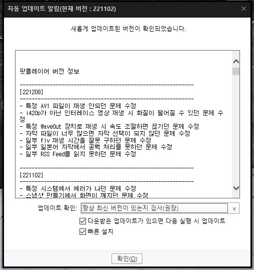 팟플레이어 업데이트 (2022년 12월 16일?) 정보 - 수정된 부분들