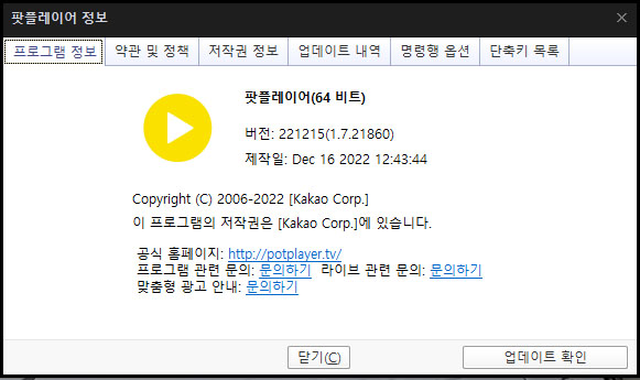 하지만 업데이트 알림이 나타난 날짜, 그리고 업데이트된 팟플레이어의 제작일을 보면 2022년 12월 16일이 이번에 업데이트된 정확한 날짜일 것입니다.