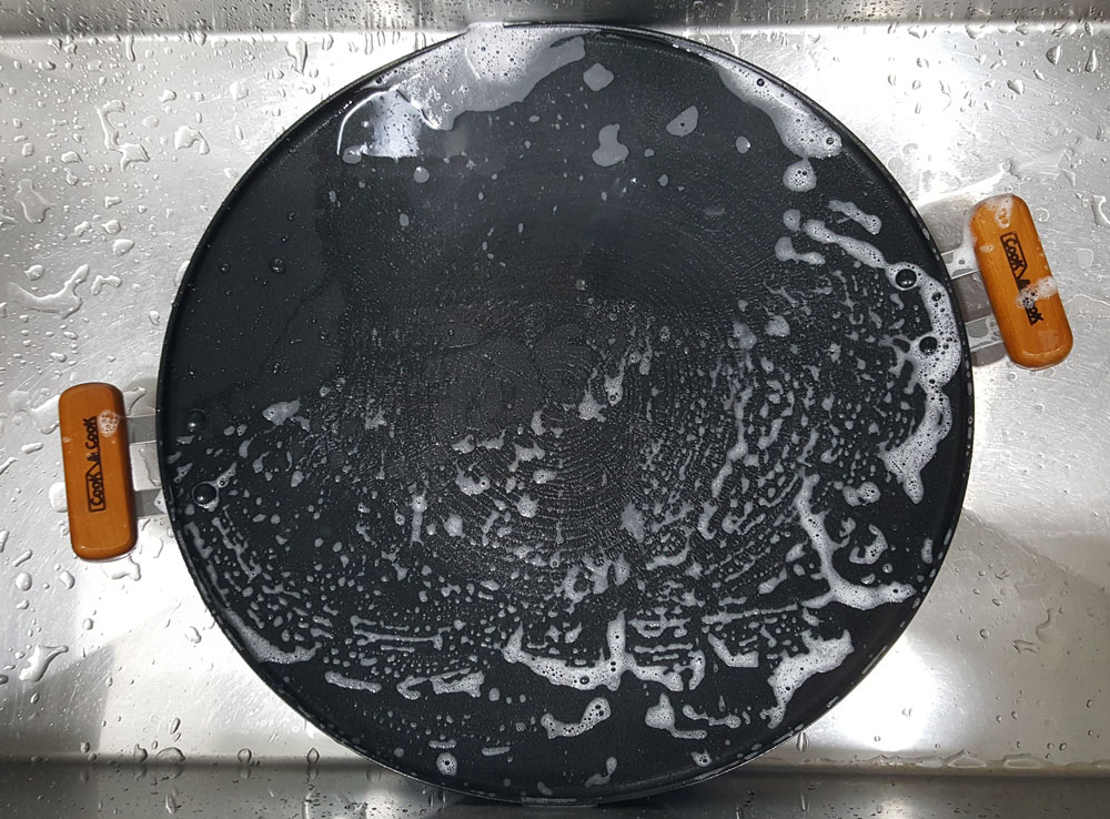 베로나 인덕션 그리들 팬 40cm 제품을 씻기 위해 싱크대에 넣었는데, 너무 커서 싱크대에 비스듬하게 놓을 수 밖에 없었습니다. 가정에서 사용한다면 지름 35cm 크기 제품이 유리할 수도 있을 것입니다.