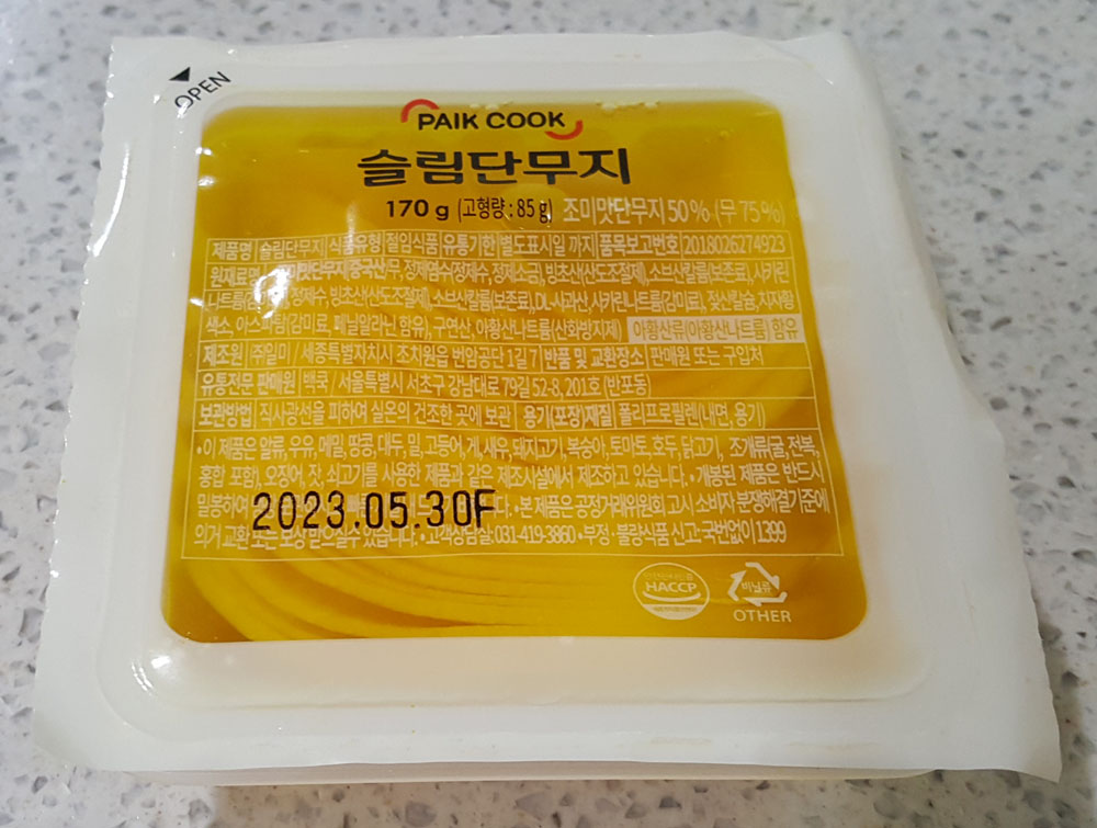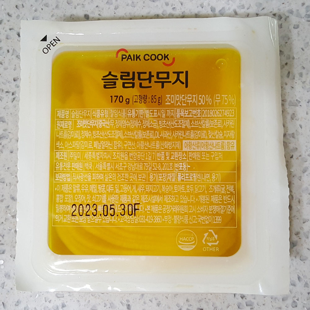 아래에 있는 것은 PAIK COOK 슬림단무지(170g)에 관한 정보로, 제품 포장에 인쇄된 내용을 그대로 옮겨온 것입니다.