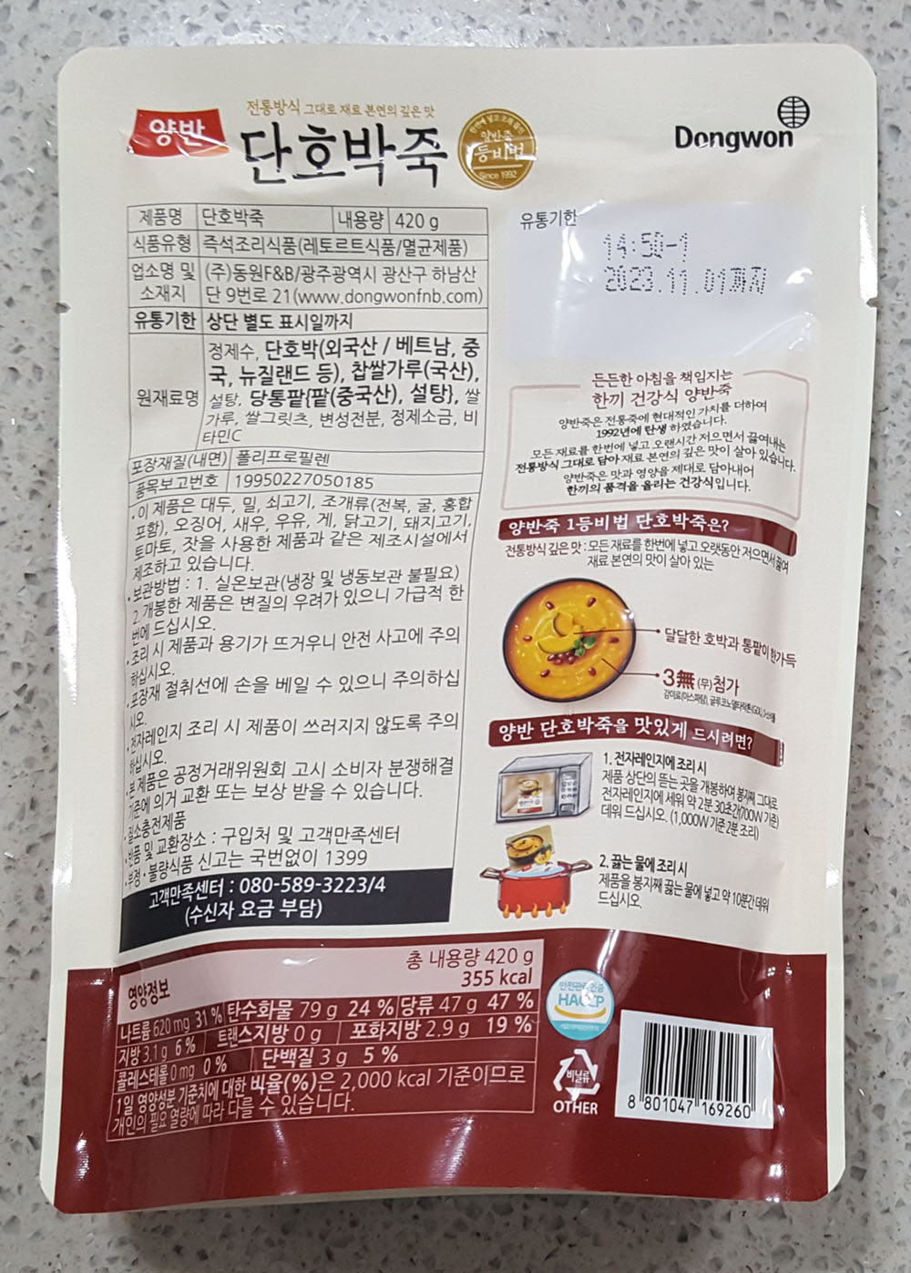 동원 양반 단호박죽 내용량, 칼로리, 원재료 (원산지), 영양정보, 단호박죽 유통기한 外