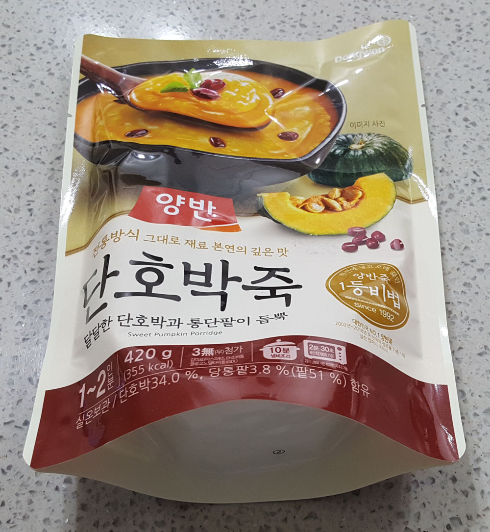 아래에 있는 것은 양반 단호박죽에 관한 정보로, 제품 포장에 인쇄된 내용을 그대로 옮겨온 것입니다.