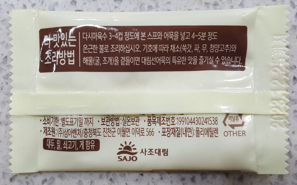 - 어묵탕용 비법소스 (복합조미식품) : 정제소금 (국산), L-글루탐산나트륨 (향미증진제), 분말간장 {산분해간장 (탈지대두: 인도산), 덱스트린, 정제소금 (국산)}, 설탕, 다시마분말 (건다시마: 국내산), 복합조미식품, 흑후추분말, 소고기맛베이스M2, 가쓰오엑기스분말F, 멸치분말, 호박산이나트륨, 카라멜분말, 향미증진제, 옥배유, 마늘분말, 가쓰오부시분말, 붉은대게농축분말, 생강분말, 이산화규소