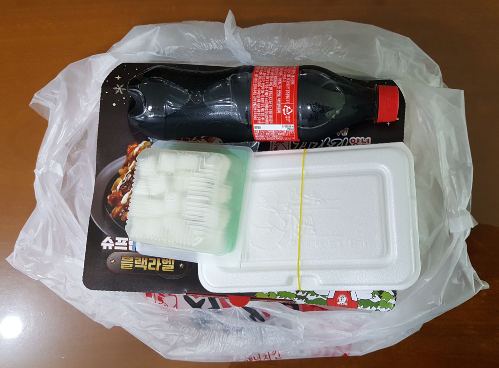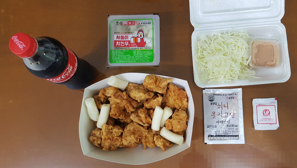 처갓집양념치킨 순살 후라이드치킨 가격, 배달비, 내용물 (코카콜라, 치킨무, 조미소금 등)