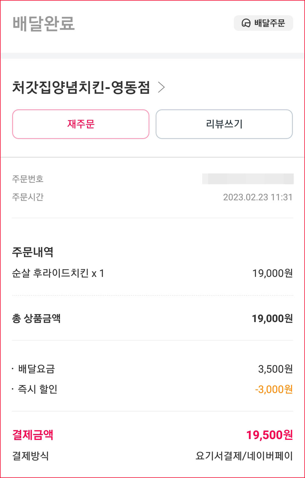 결제한 금액 : 19,500원 (요기요 앱에서 3,000원 할인 쿠폰 사용)