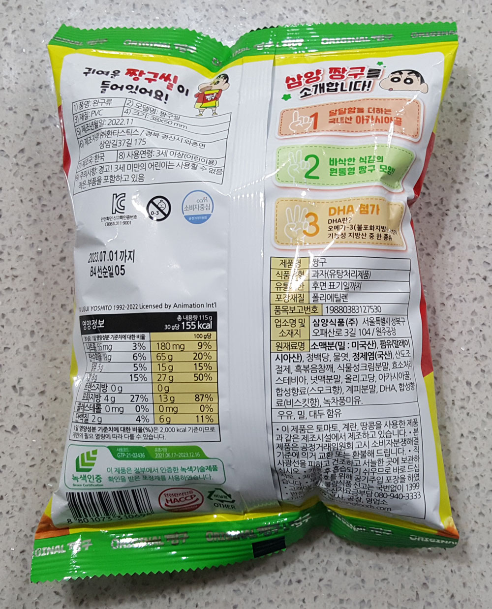 개인적으로 삼양 짱구(ORIGINAL 최초의 짱구) 과자 보다는 크라운 못말리는 신짱 과자가 조금 더 맛있게 느껴졌습니다.