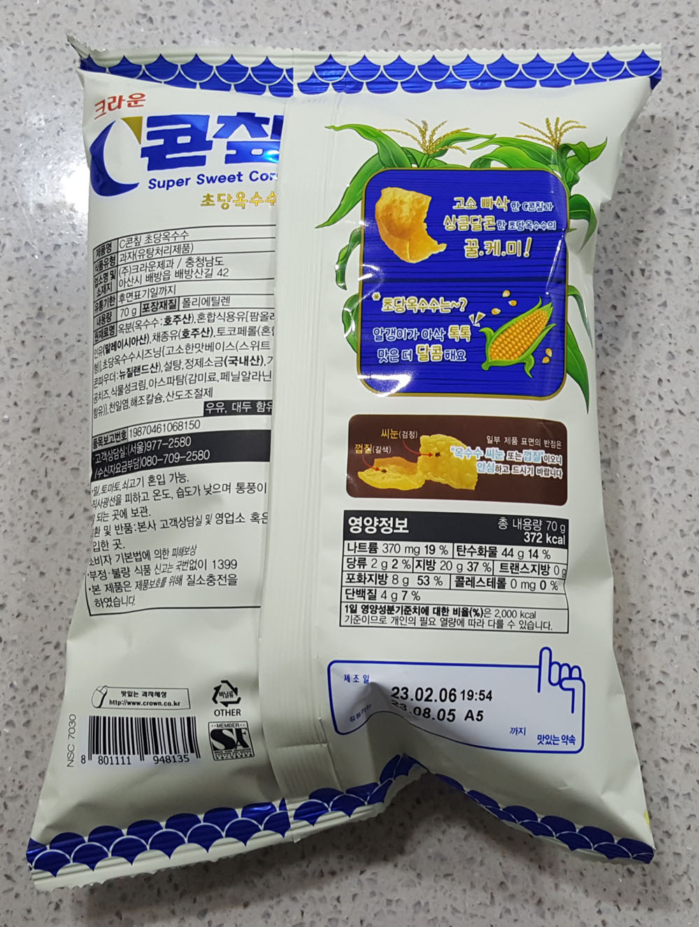 크라운 콘칲 C콘칲 초당옥수수 70g 칼로리, 가격, 품목보고번호, 원재료 및 영양정보, 유통기한 外