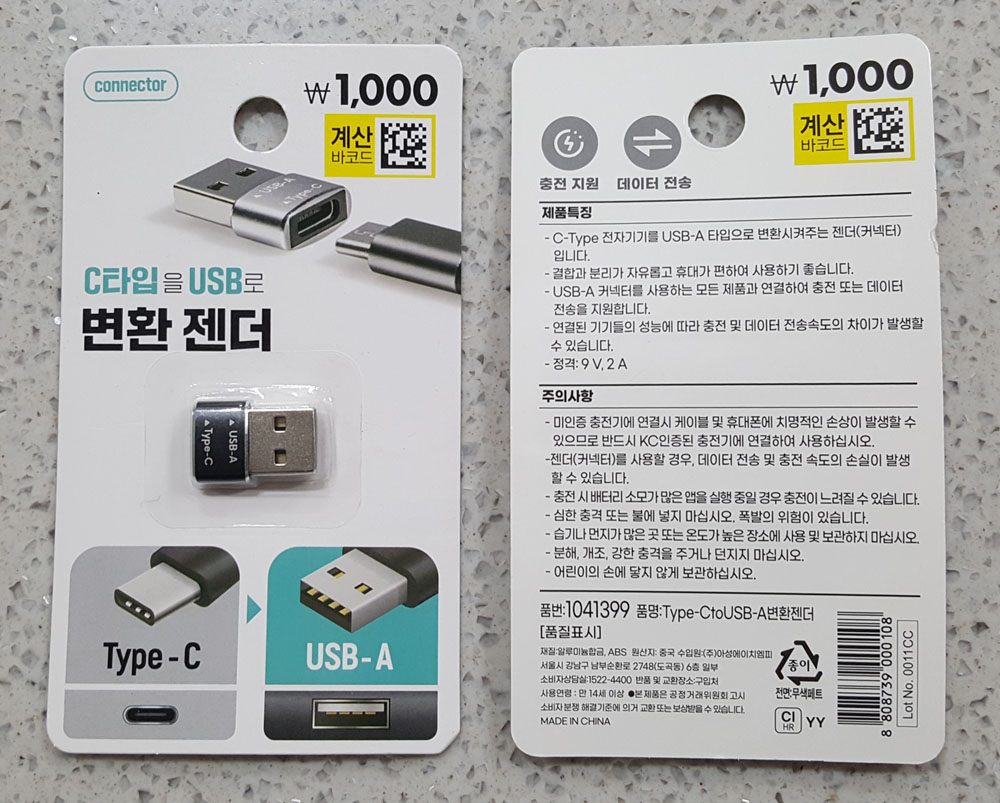 다이소 Type-C to USB-A 변환 젠더 (C타입을 USB로 변환 젠더) 가격, 재질, 원산지, 충전 데이터 전송 가능, 주의사항 外