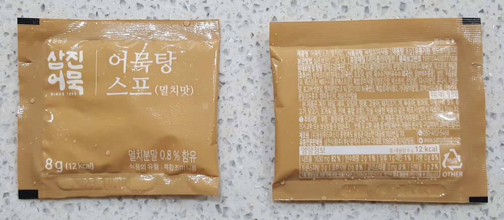 - 어묵탕 스프 (멸치맛) : 정제소금 (국산), L-글루탐산나트륨 (향미증진제), 분말간장 [탈지대두 (외국산), 덱스트린, 천일염 (호주산)], 삼아조미분 [정제소금 (국산), 포도당, 설탕, 옥수수전분 (옥수수: 외국산), 밀분해추출물], 설탕, 무즙분말 [무, 덱스트린, 베타-시클로덱스트린], 복합조미식품1 [양조간장, 덱스트린, 천일염], 다시마분말, 혼다시, 마늘분말, 표고버섯분말, 멸치분말 0.8% [멸치 100% (국산)], 복합조미식품2, 가다랑어분말, 호박산이나트륨, 카놀라유, 분말검은후추, 향미증진제, 제삼인산칼슘