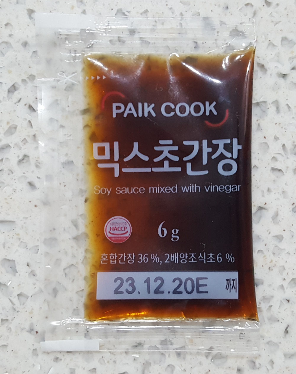 아래에 있는 것은 홍콩반점에서 탕수육 등을 시킨 후 함께 포장되어 배송된 PAIK COOK 믹스 초간장에 관한 정보로, 제품 포장에 인쇄된 내용을 그대로 옮겨온 것입니다.