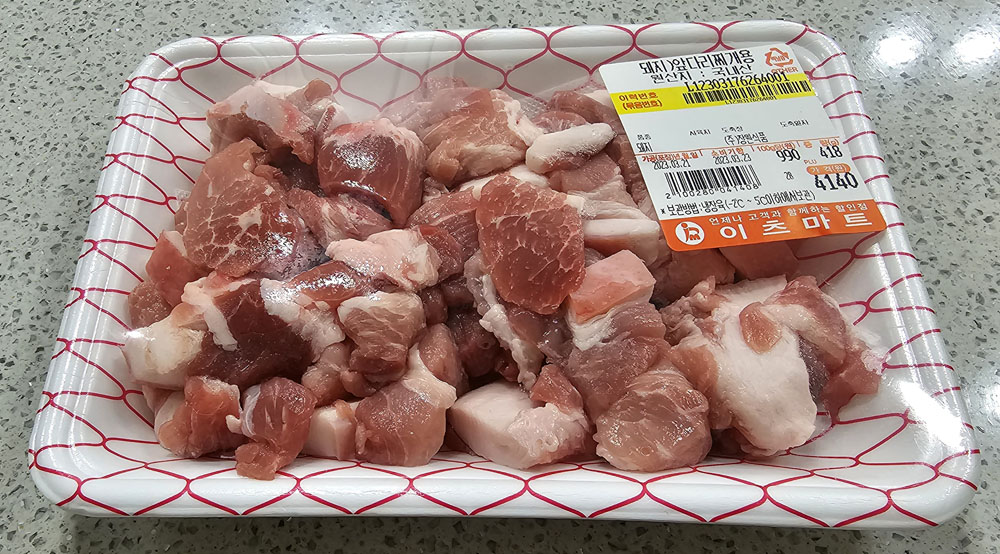 - 국내산 돼지고기 앞다리살(찌개용)의 가격은 100g당 990원입니다.
