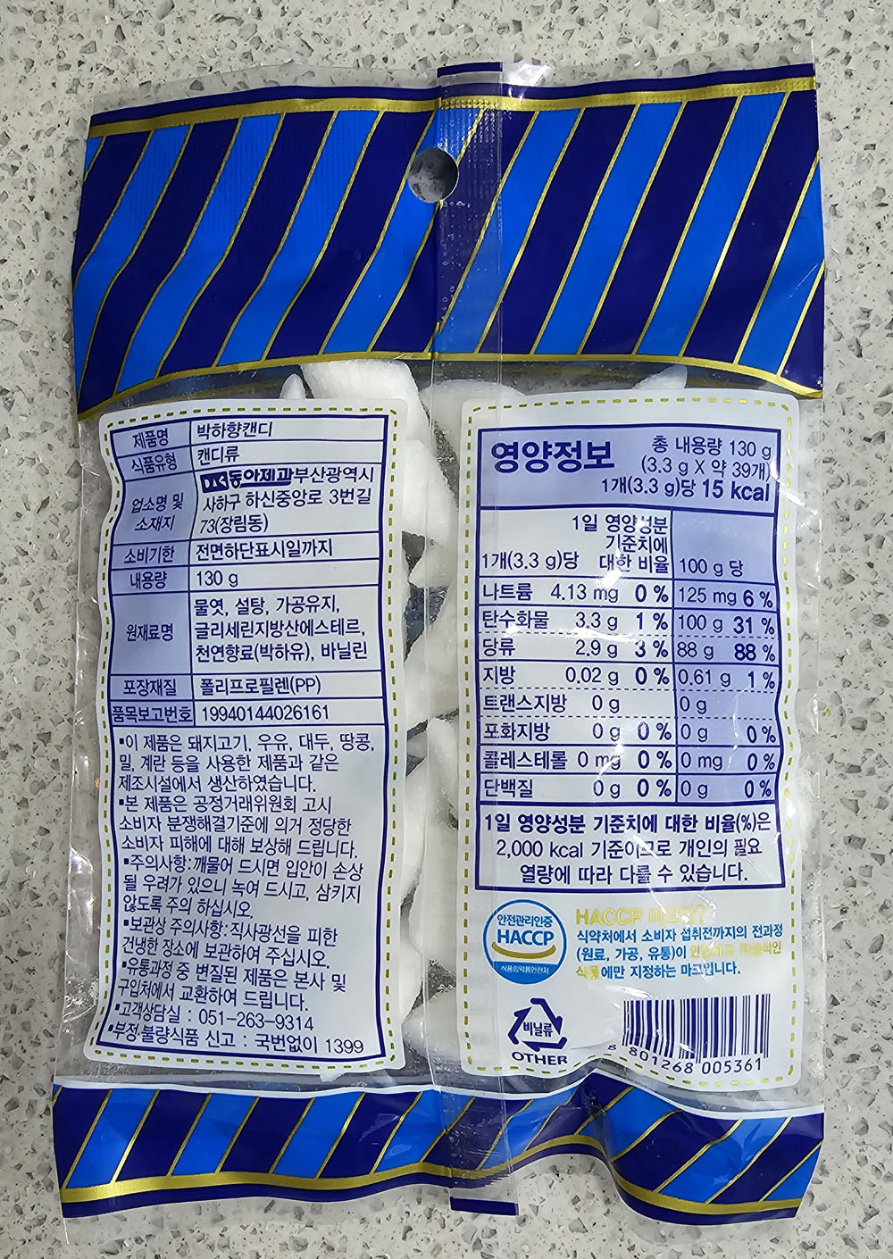 동아제과 박하향 캔디 130g 칼로리, 가격, 품목보고번호, 박하향 캔디 원재료 및 영양정보, 소비기한 外