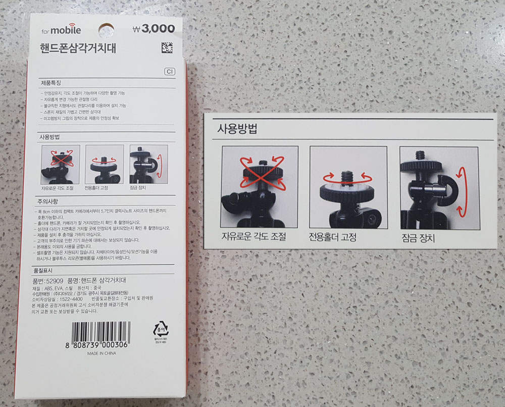 아래에 있는 것은 다이소에서 구매한 핸드폰 삼각거치대에 관한 정보로, 제품 포장에 인쇄된 내용을 그대로 옮겨온 것입니다.