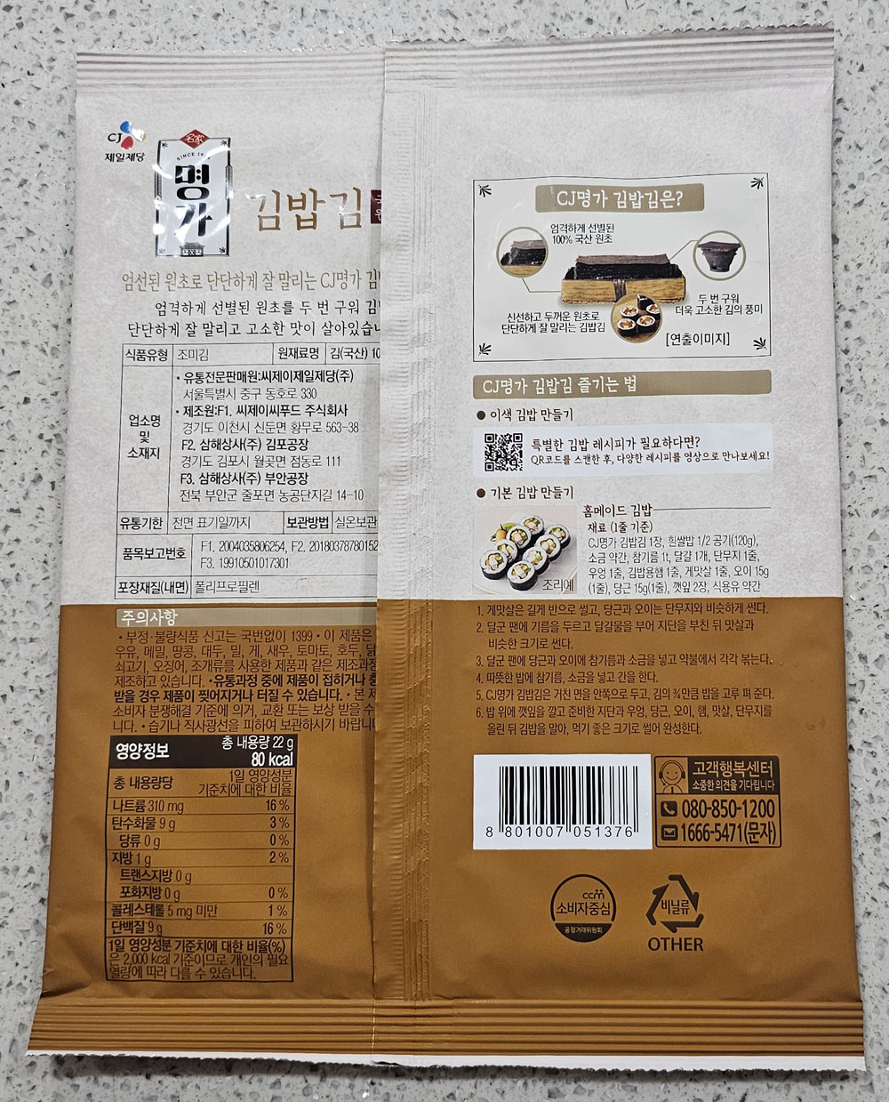 CJ 명가 김밥김 내용량, 칼로리, 제조원, 원재료 및 영양정보, 김 보관방법 및 유통기한 外