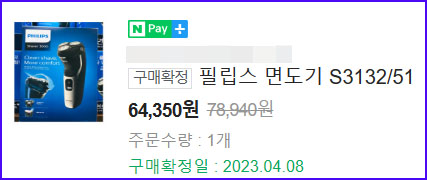 인터넷에서 64,350원의 가격에 구매한 필립스 전기면도기 S3132/51 제품에 관한 정보로