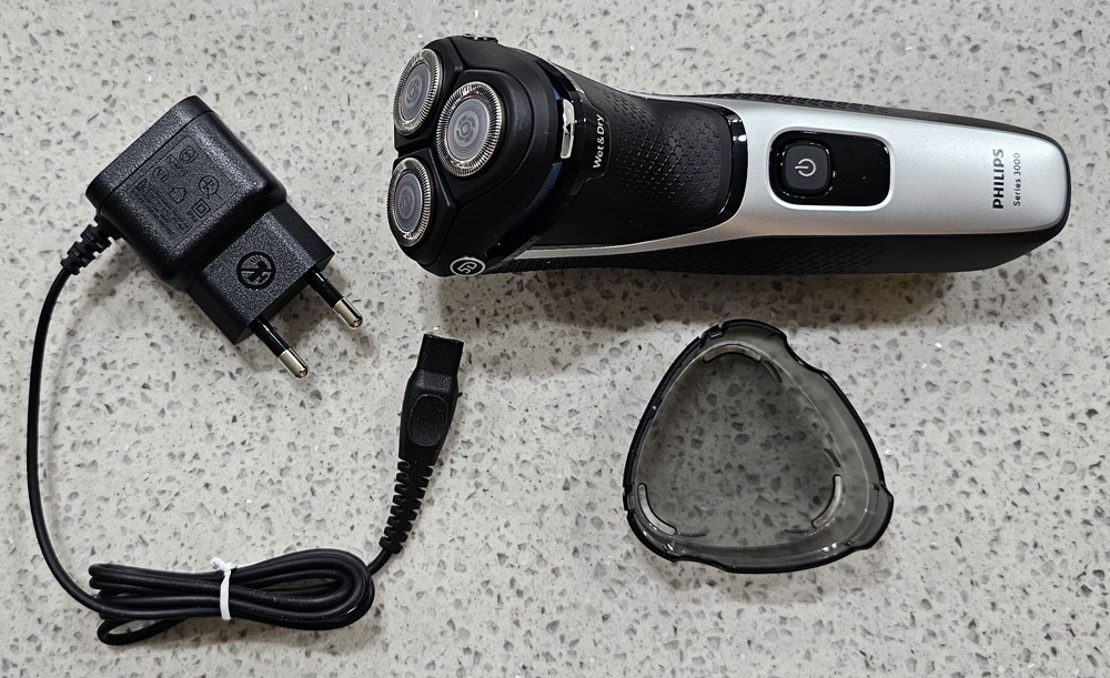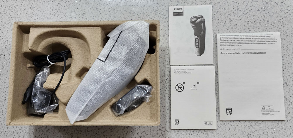 제품 구성 : 면도기 본체, 충전 어댑터, 보호캡, 인쇄물 (사용설명서, 품질보증서 등)