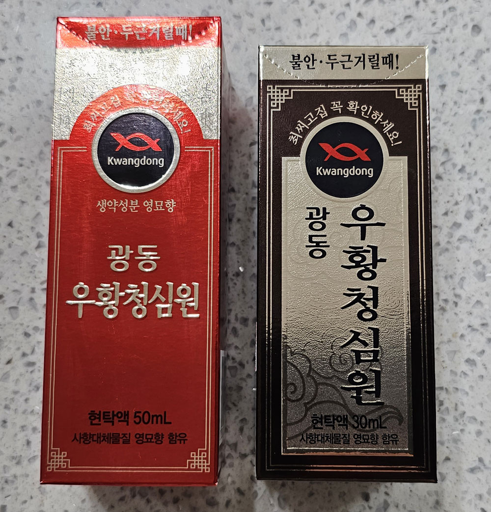▲ 5천원에 구매한 우황청심원 현탁액 50mL (왼쪽), 4천원에 구매한 우황청심원 현탁액 30mL (오른쪽)