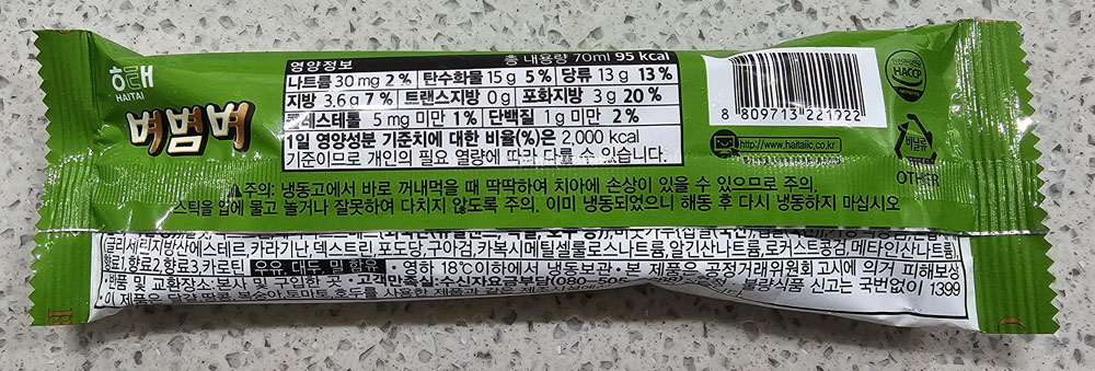 해태 벼볌벼 막대 아이스크림 내용량, 칼로리, 가격, 제조연월일, 원재료 및 영양정보 外