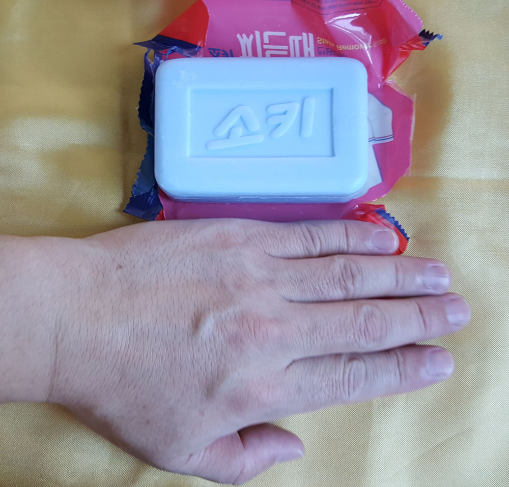 소키 찌든때 전용비누는 하나로마트에서 1천원 정도의 가격에 구매한 빨래비누로, 시중에 많이 판매되는 빨래비누보다 크기가 조금 작은 편입니다. (세수비누와 크기가 비슷하고, 두께는 두꺼운 편입니다.)