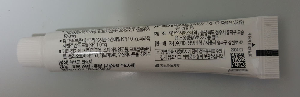 - 유효성분 : 테르비나핀염산염(JP) 10.0mg, 글리시리진산이칼륨(KP) 5.0mg, 리도카인(KP) 20.0mg, L-멘톨(KP) 10.0mg